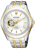 Dress / Sport watch, tre lancette movimento automatico la visualizzazione di lucido oro-tono lancette di ore e minuti con accenti luminosi e secondi continui lucido, applicata e lucido oro-tono bastone indici, numeri neri / indici segnano secondo trimestre e la pista esterna minuto, lucidato bicolore lunetta in acciaio inossidabile rotondo e caso con accenti spazzolati, lucido corona dorata, Exhibition fondello in acciaio a vite, vetro minerale, 100 meters/330 piedi acqua toni resistantSilver-e-oro tutto dare